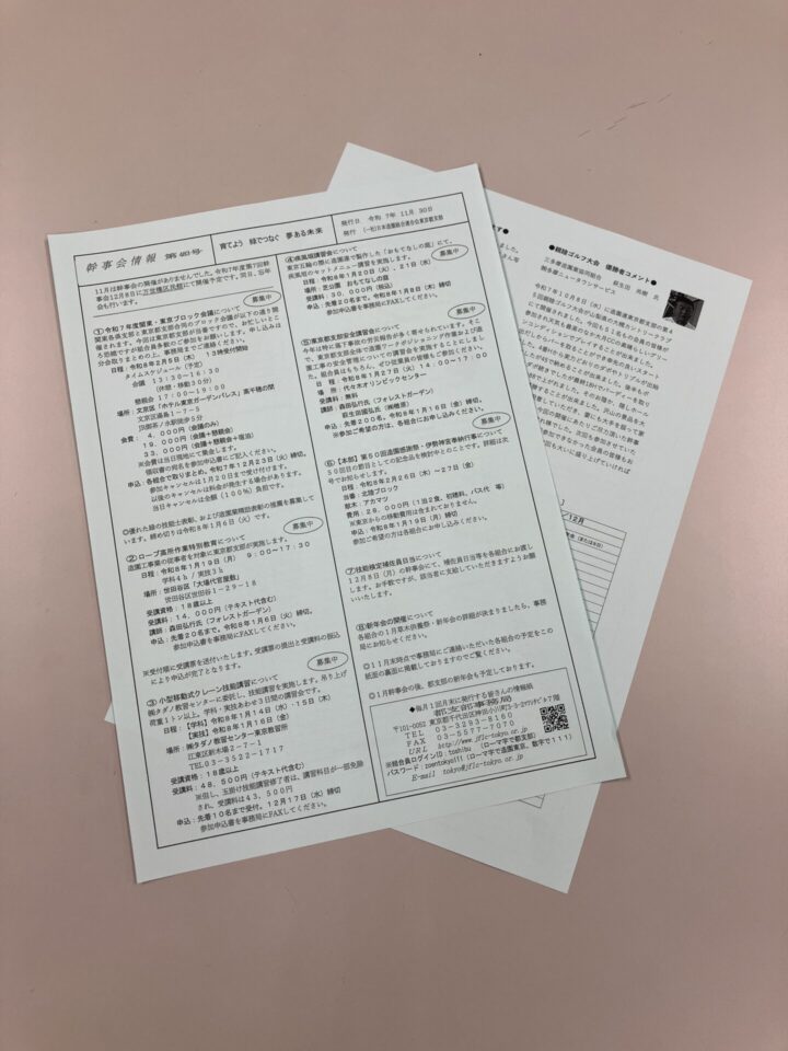 また東京都支部独自のコミュニケーションツールとして、紙の「幹事会情報」も毎月末に発行しています。幹事会で検討・決定した講習会の募集や各種イベントの案内などがB4サイズの表裏にびっしり記載されており、各組合経由で全組合員に配布しています。