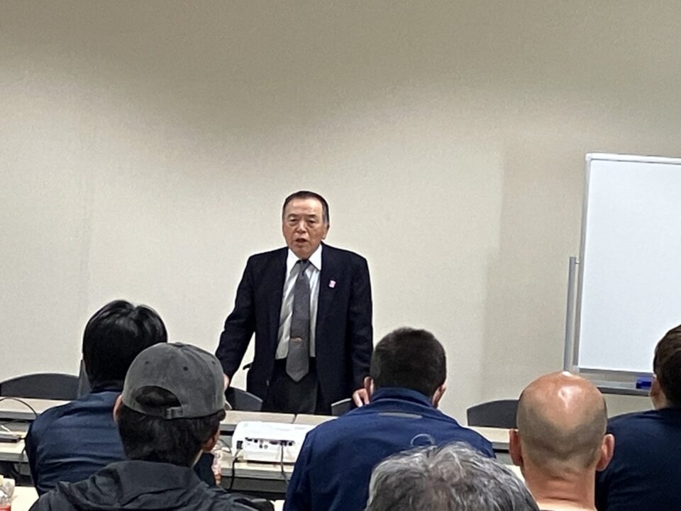 参加者全員が順番に、重大事故になりそうだったヒヤリハットを発表し、どうすればよかったか、以後どのように改善したかを報告しました。最後に、建設業における災害発生時の緊急連絡体系の動画を見ました。
