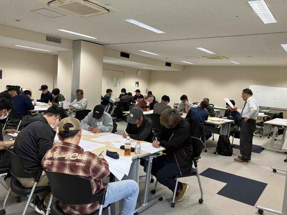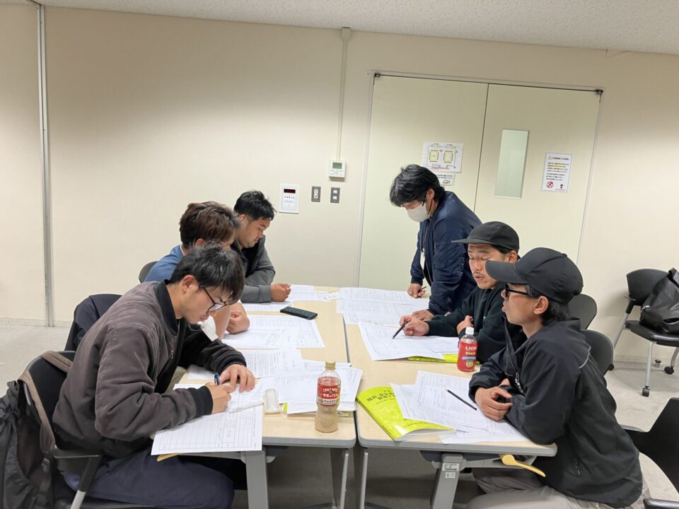 造園工事現場で「職長」の任を担うということは、自分が指示を出す部下の安全に責任を持たなければいけないということです。初日は、そうした職長の責務・心構えと安全衛生責任者としての役割を安全衛生法に基づき学び、作業における危険度の点数化を学びました。