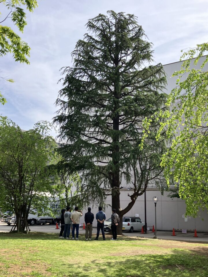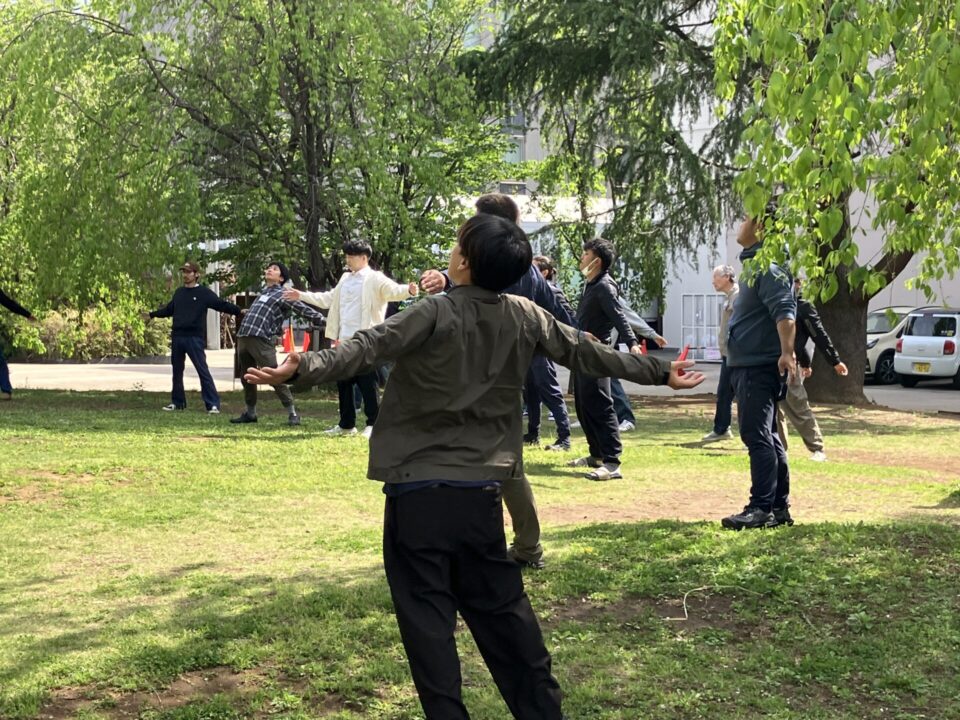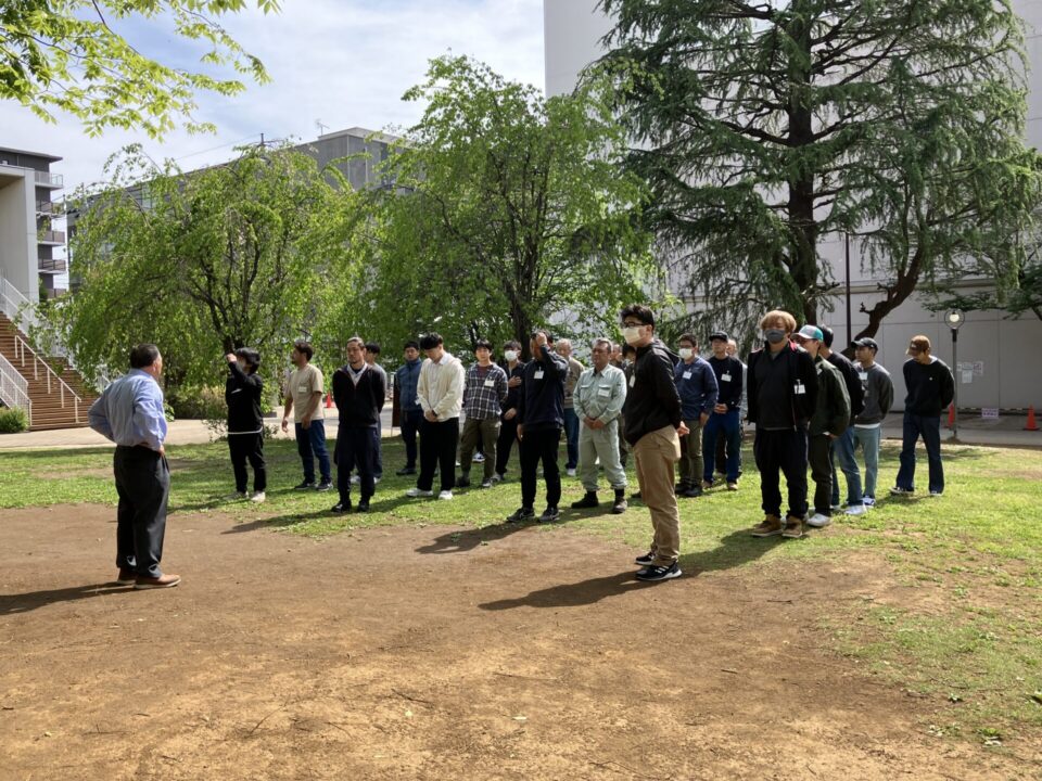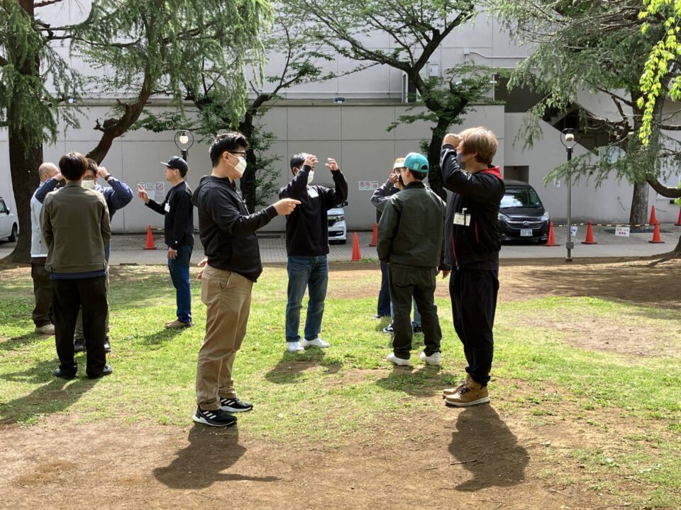 2日目は日常業務のイメージトレーニングを兼ねて、屋外に出てラジオ体操からスタート。高木を教材に、どのようにして安全確認を行うか、実際に身体を動かし声を出しておさらいしました。