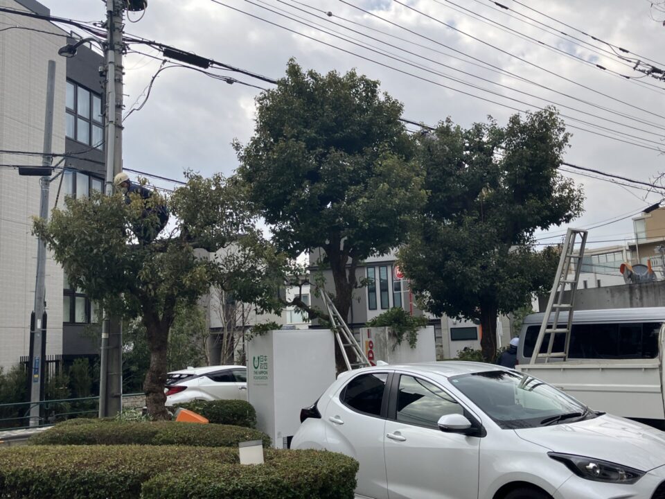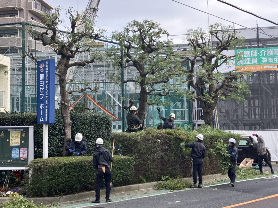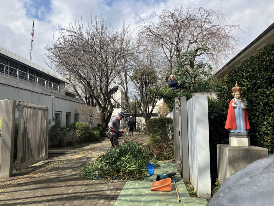 造園連東京都支部の青年部による剪定奉仕活動が、令和8年3月18日(水)に聖ヨゼフホーム(西東京市)にて実施されました。今年は通路沿いを中心に行いました。