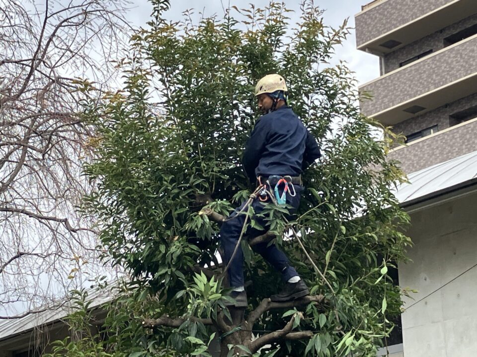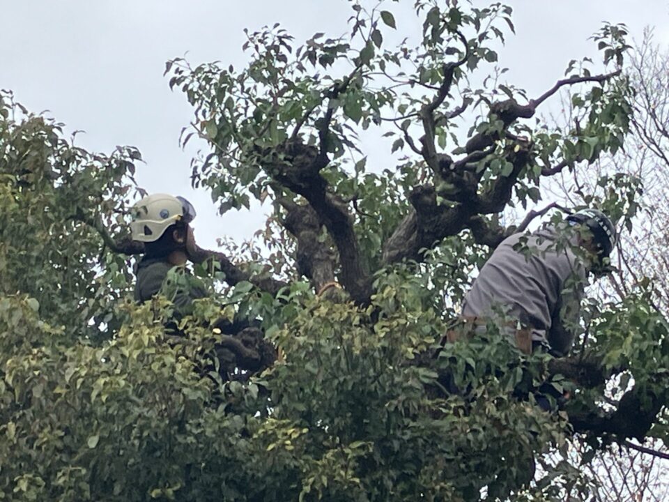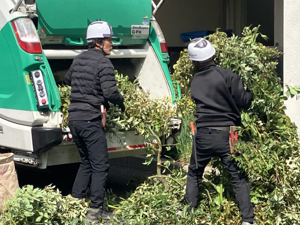 剪定は上から下へが基本です。高木の場合、登ってしまうと全体像がつかみにくいため、地上から指示をもらって作業します。下に落ちた枝葉は通行の邪魔にならないよう素早く回収します。