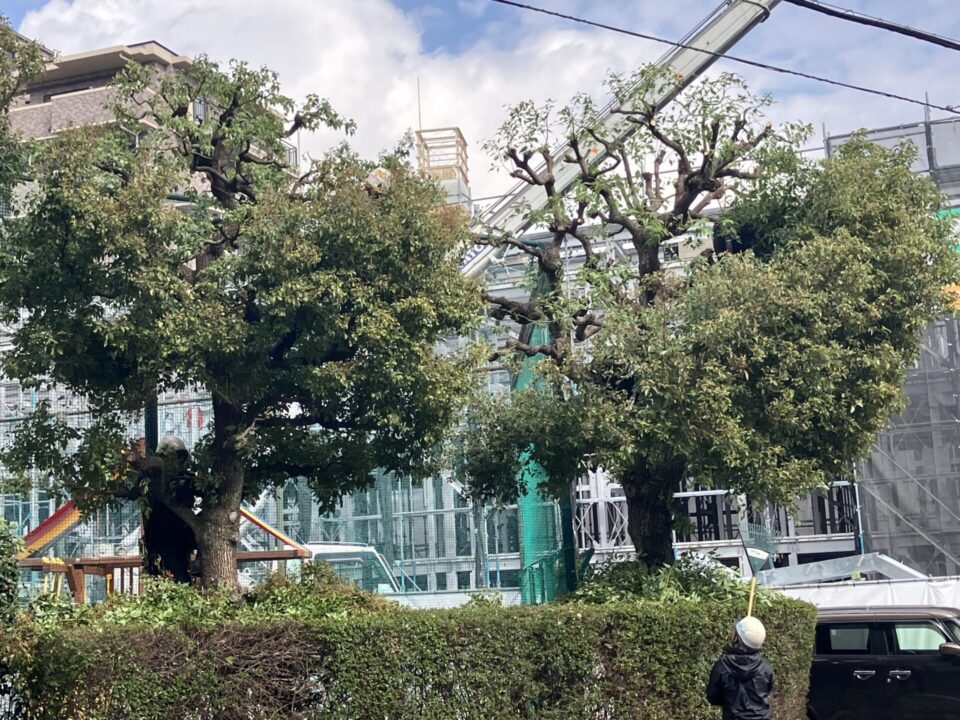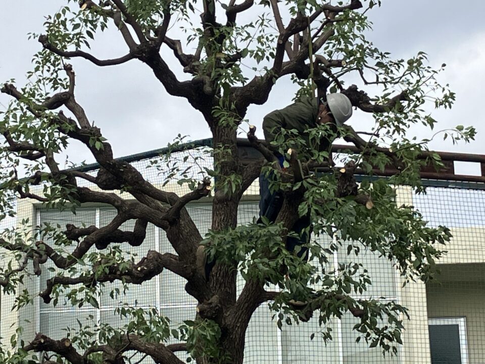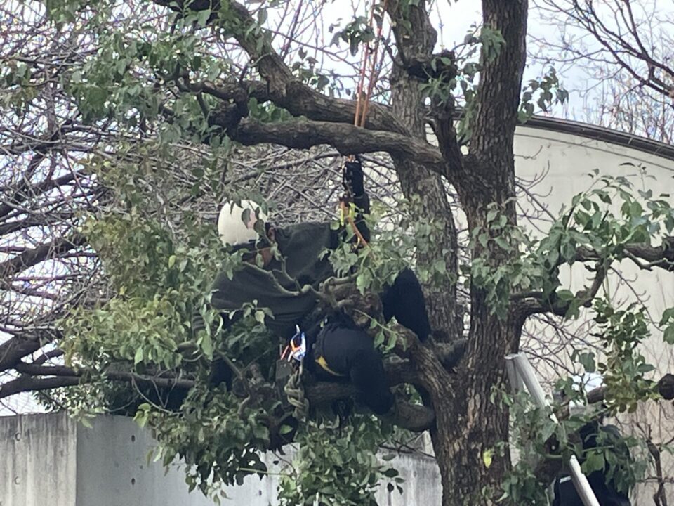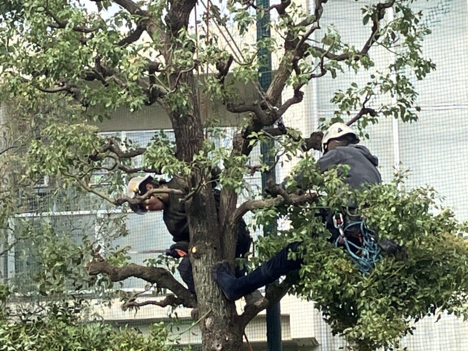 朝8時30分前に14名が集結。役割分担とKY(危険予測)の確認を終えると、外周に沿って植えられた高木に次々と登って剪定を行いました。腰から伸びているのは、造園ワークポジショニングのロープです。造園ワークポジショニングについては、この記事の後半でご案内します。
