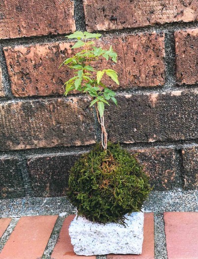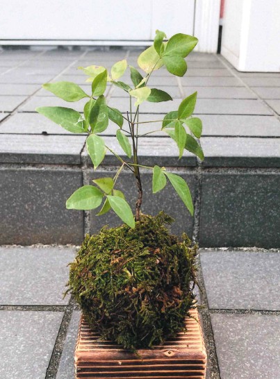 インテリアとして人気の苔玉は、苗木の根を球状に苔で包む伝統的な園芸技法です。石、竹、木、焼き物などの器とセットです。